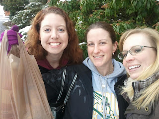 Happy happy tummies!!! Since Saturday was Girls' Night Out, Sunday was Girls' Night In. Megan is an excellent cook and baker, and since Heather and I are not so much 'with the cooking', she offered to make us a homecooked meal, complete with dessert. Fine by us! Since it had started to snow, and people in the PNW (Pacific Northwest) aren't so great at driving in the snow, we decided to jump into our warm clothes, strap on our boots, and walk to the grocery store to pick up the necessary ingredients. The Albertson's is only a few blocks away, and the snow was so pretty, so it ended up being a very fun adventure.